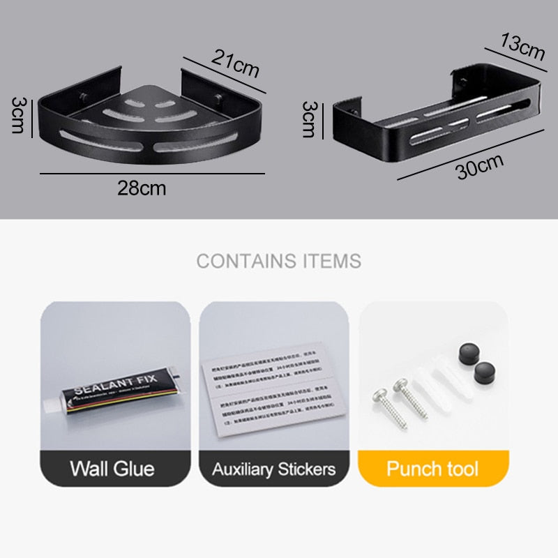 This shelf is made of quality aluminum alloy with corrosion-resistant surface. It is suitable for humid environments such as bathroom (even in shower) and kitchen.